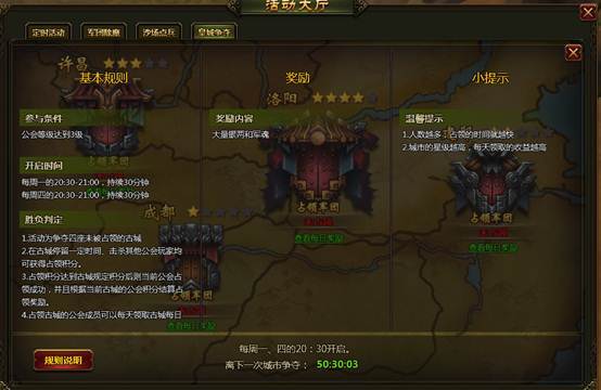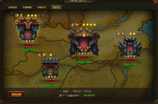 1、 活动为争夺四座未被战力的古城,许昌、洛阳、程度、建邺。